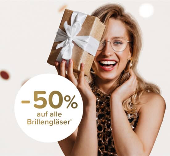 *1Sie erhalten beim Kauf der 1. Brille 50 % auf die Brillengläser von Meisterglas®. Der Rabatt wird automatisch vom Hersteller-UVP abgezogen. Gültig bis 30.04.2024. Rabatte gelten nur für Neuaufträge und sind nicht mit anderen Aktionen / Paket- oder Komplettbrillenangeboten/Gutscheinen kombinierbar. Keine Barauszahlung möglich. Wir behalten uns das Recht vor, diese Aktion zu verlängern.