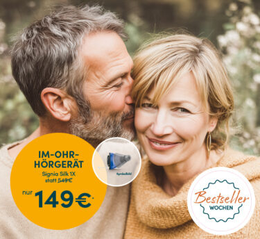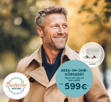 *Aktionspreis gültig bis 20.11.2025 für 1 Im-Ohr Hörgerät der Type Signia Silk 1X. Aktionspreis/Stattpreis gelten für Mitglieder gesetzl. Krankenkassen mit Leistungsanspruch u. ohrenärztl. Verordnung, zzgl. der gesetzl. Zuzahlung von 10€ pro Hörgerät. Privatpreis auf Anfrage. Wir behalten uns vor die Aktion zu verlängern. Bild mit KI erstellt.
