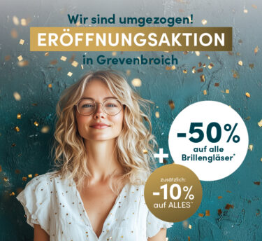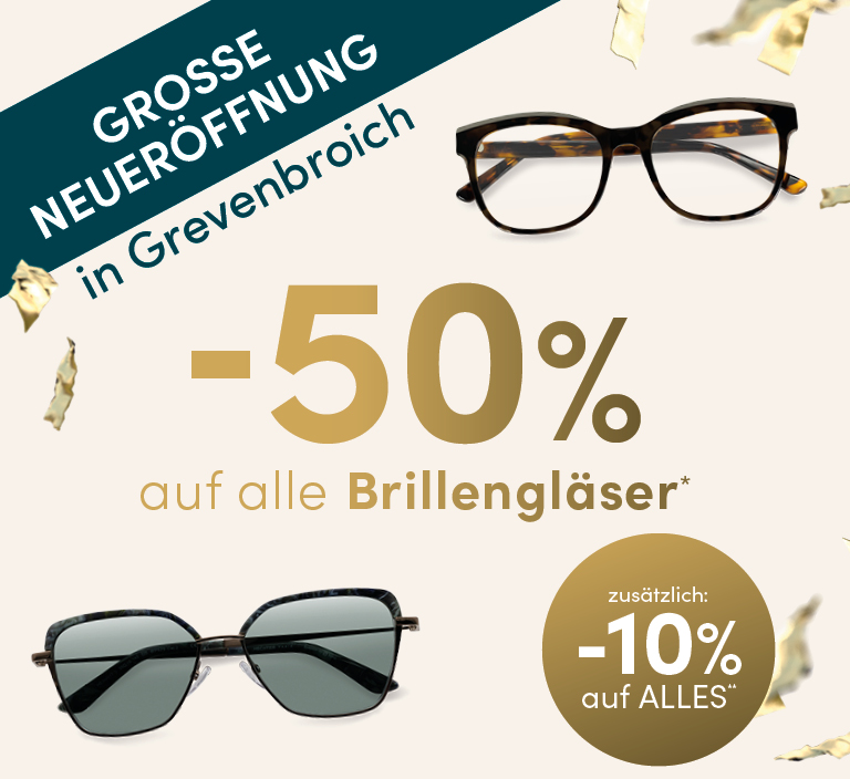 Sie sparen -50% auf alle Brillengläser* und erhalten zusätzlich -10% Eröffnungsrabatt auf alles.**