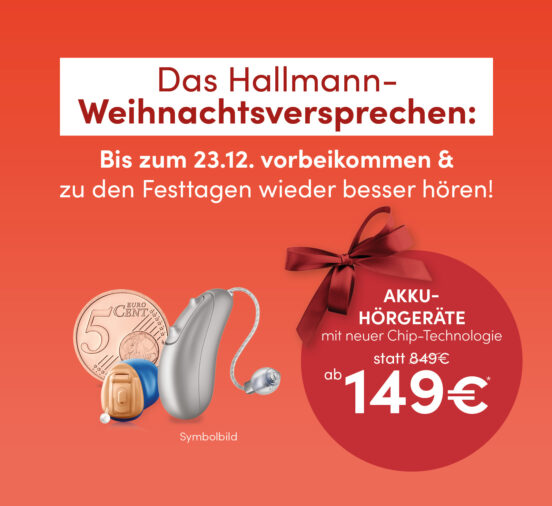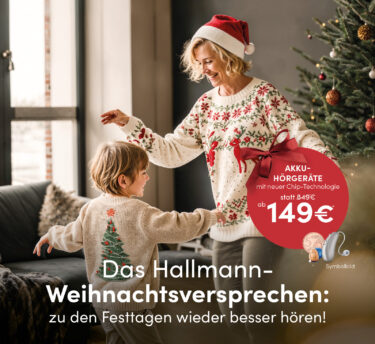 Mit unserem Weihnachtsversprechen möchten wir das ändern! Besuchen Sie uns bis zum 23. Dezember in einem Hallmann-Hörstudio, machen Sie einen Hörtest – und hören Sie zu den Festtagen wieder alle Klänge mit einem neuen Hörgerät.