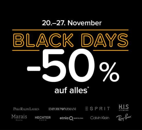 *Gültig bis 18.11.2023 beim Kauf von Meisterglas® Brillengläsern/Sonnengläsern. Sie erhalten beim Kauf einer Brille 50 % Rabatt auf die Brillengläser von Meisterglas®. Der Rabatt wird automatisch vom Hersteller-UVP abgezogen.