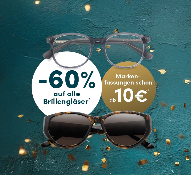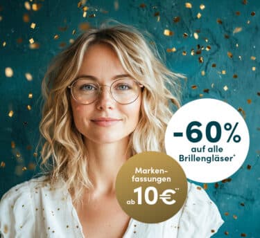 Feiern Sie jetzt mit uns und sichern Sie sich -60 % auf alle Brillengläser* – zusätzlich erhalten Sie Markenfassungen schon ab 10 €**.